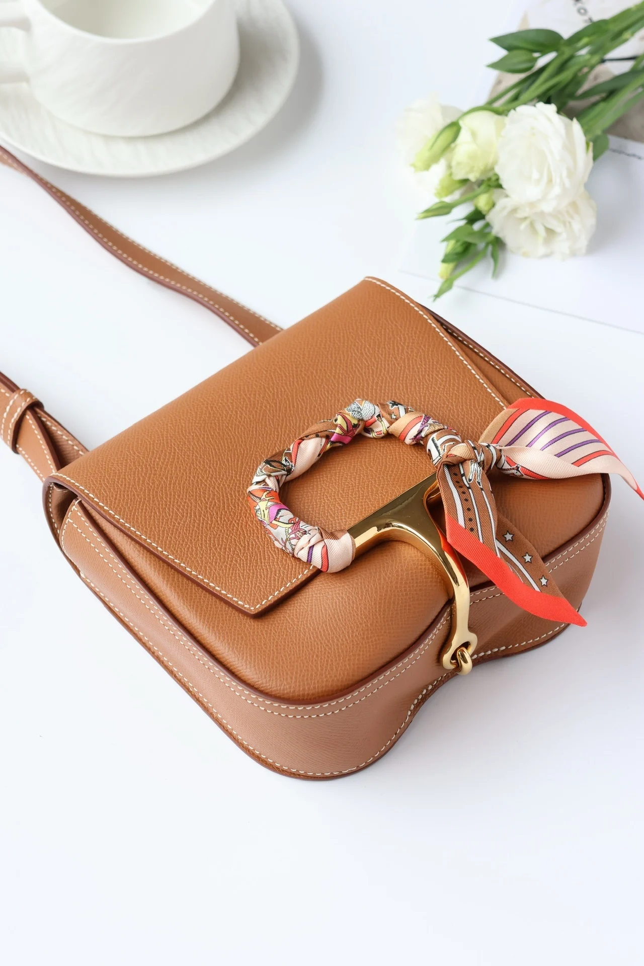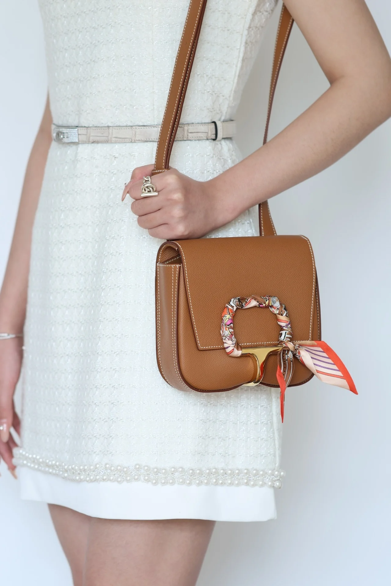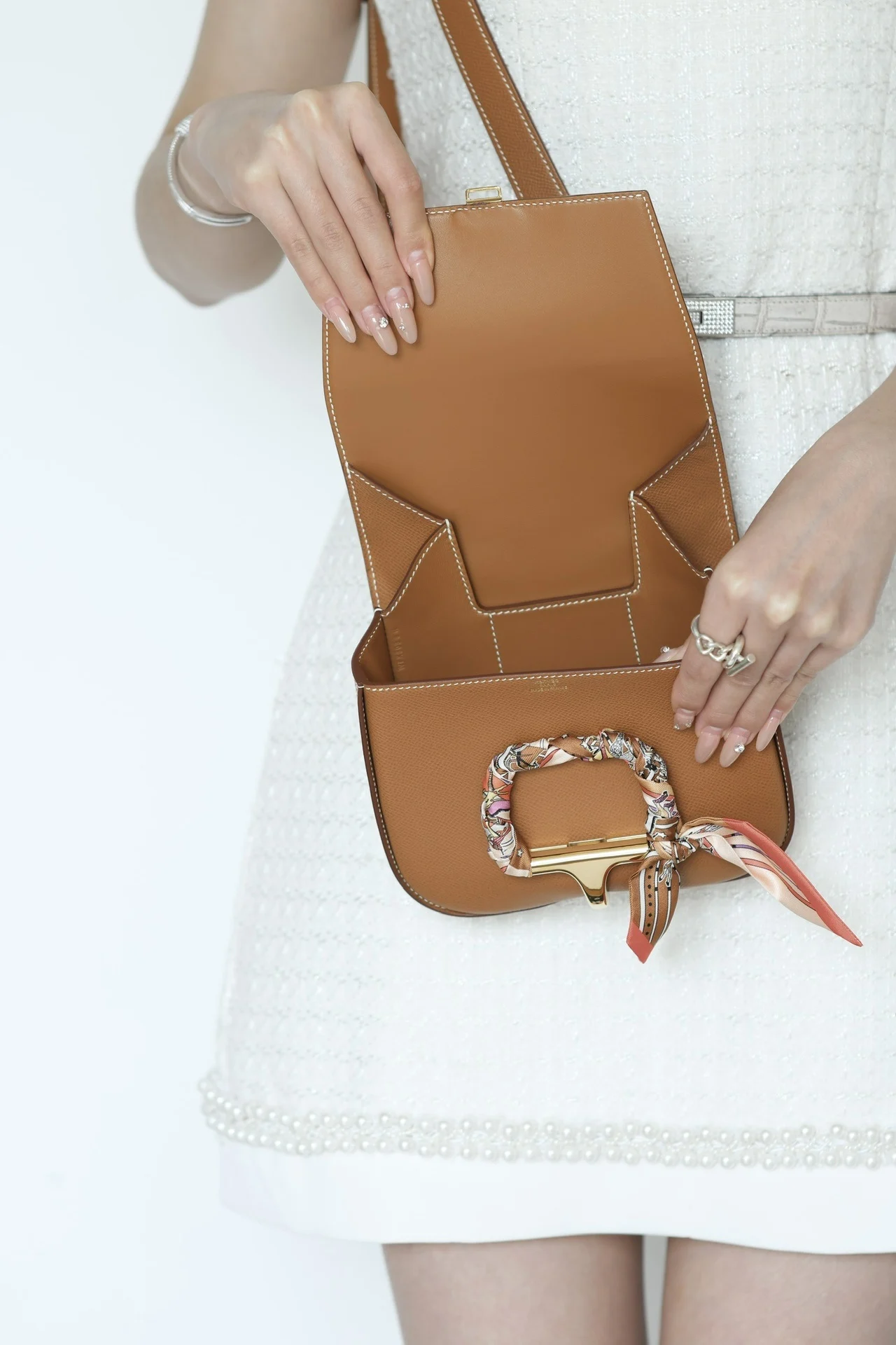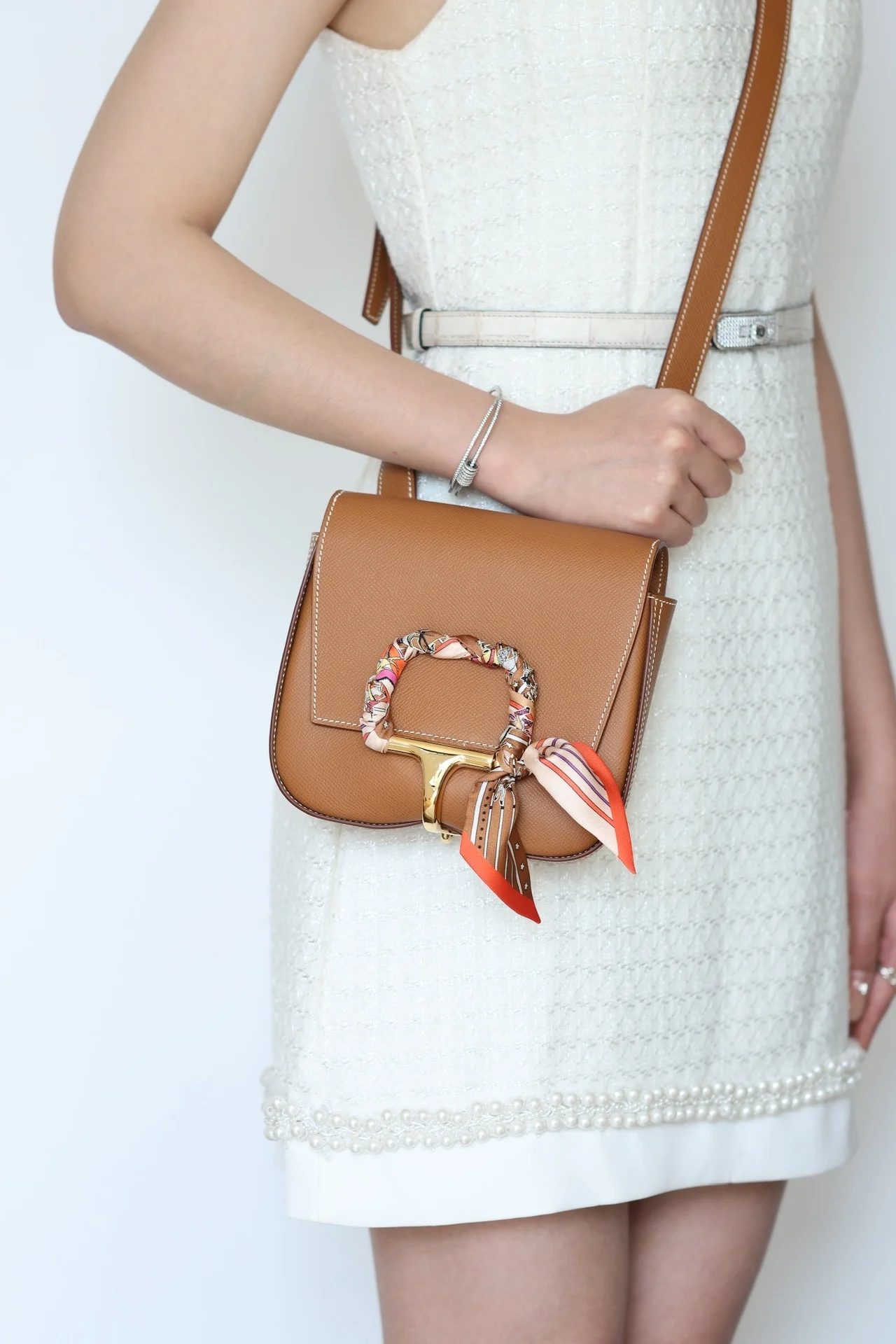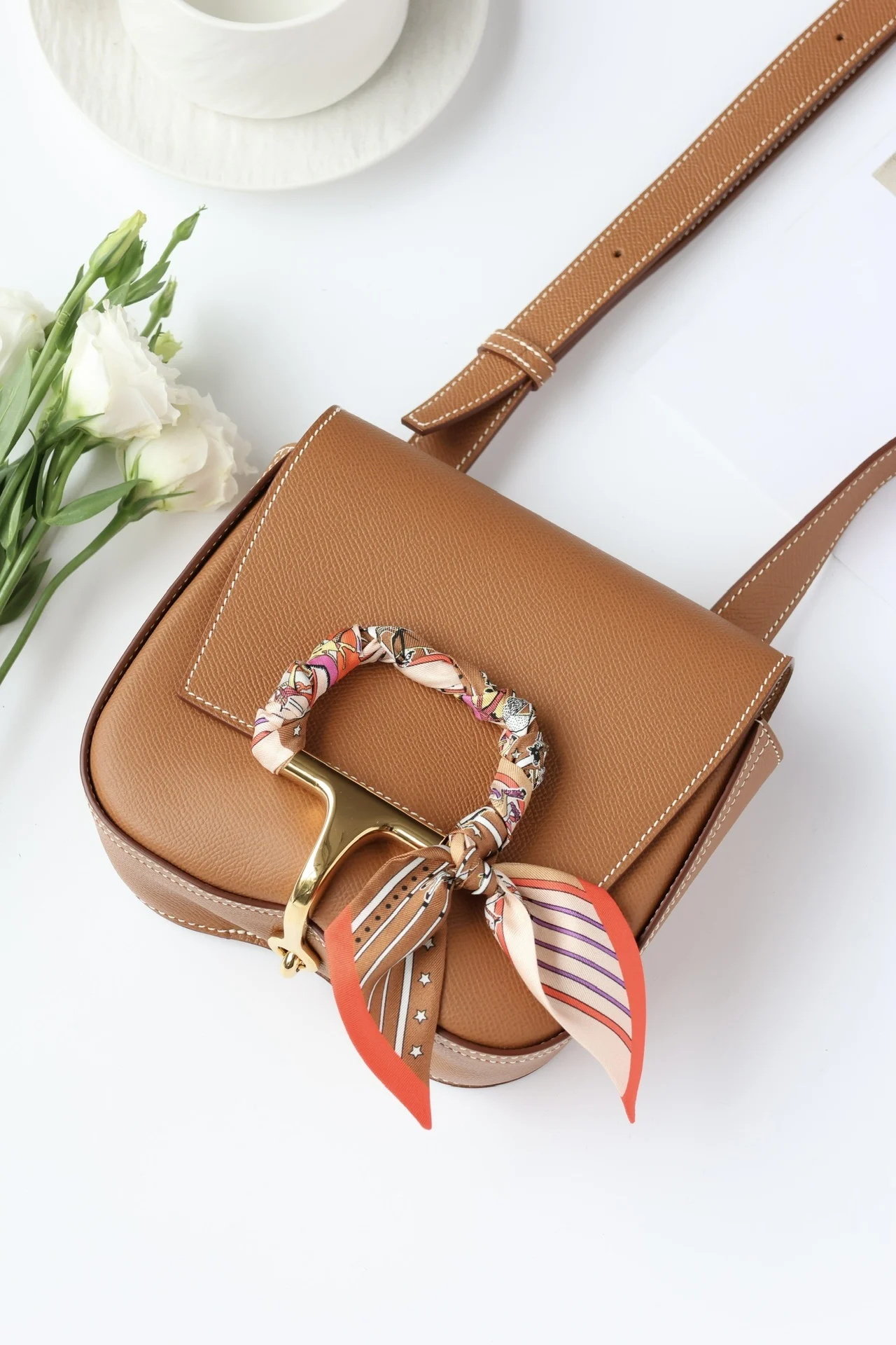 Della Cavalleria is a 17th century horse riding manual preserved at the Émile Hermès Museum, which has previously given its name to a silk scarf, and now refers to a truly innovative women’s bag. Embracing the silhouette of a half bit, its jewel clasp closes the flap and shapes the curves of the bag, evoking the contour of Hermès saddles. The metal hasp on the bottom attaches the clasp to the minimalist mechanism for easy and subtle opening and closing. Thanks to an adjustable strap, the mini version of the bag can be worn on the shoulder or across the body.