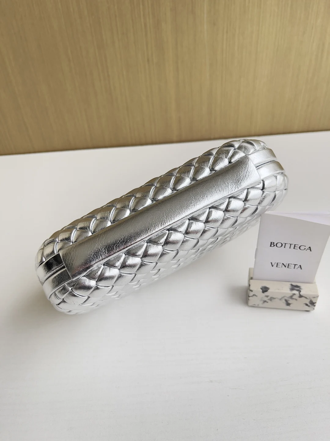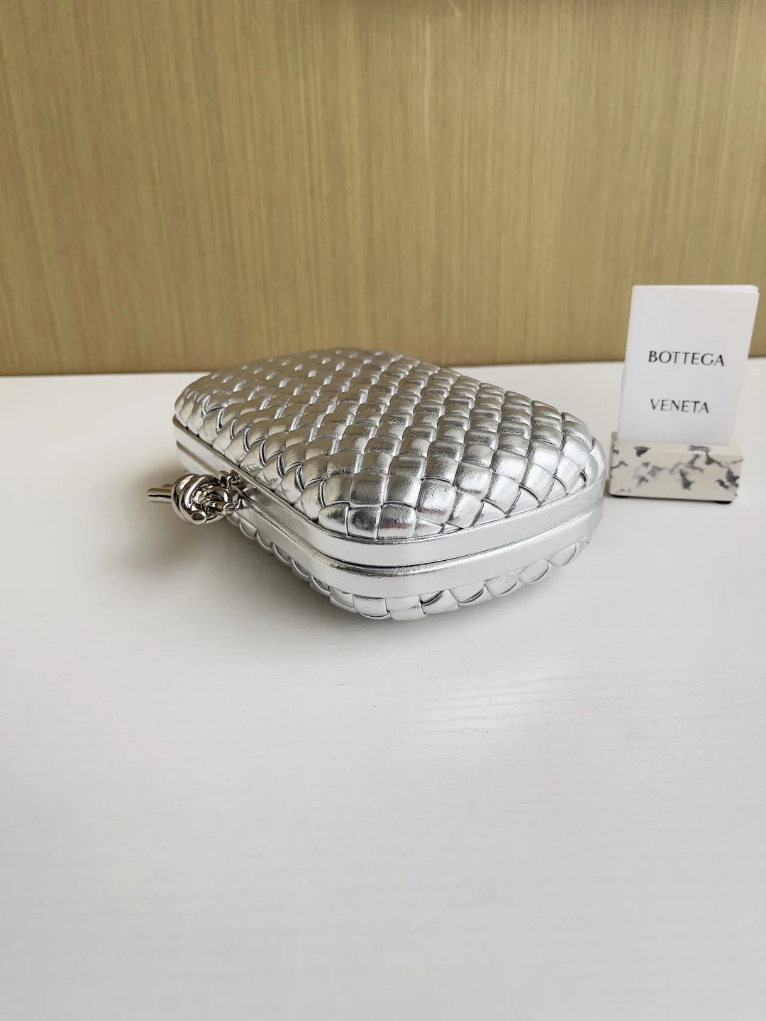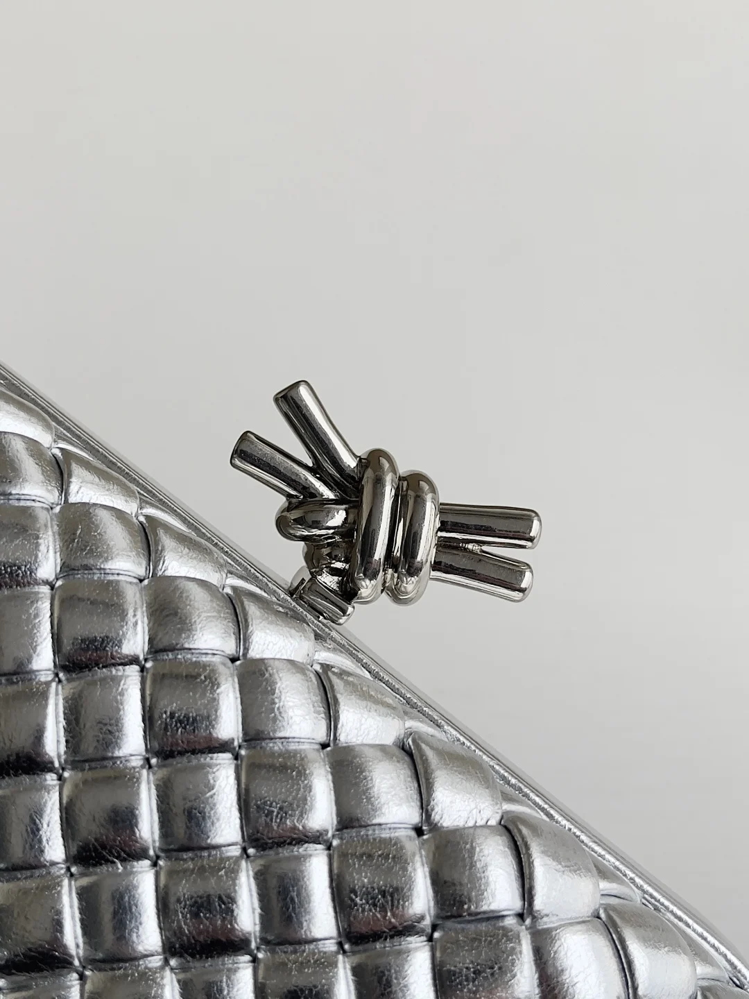 Minaudière clutch in padded Intrecciato wood-embossed laminated leather with signature knot closure.