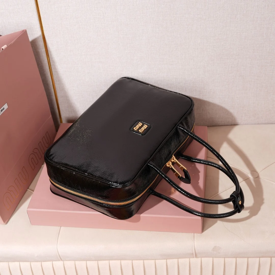 Miu Miu Beau Naplak Patent Leather Bag in Palisander (a rich, glossy brown). This model is a fusion of retro-inspired bowling bag silhouettes and contemporary luxury.
