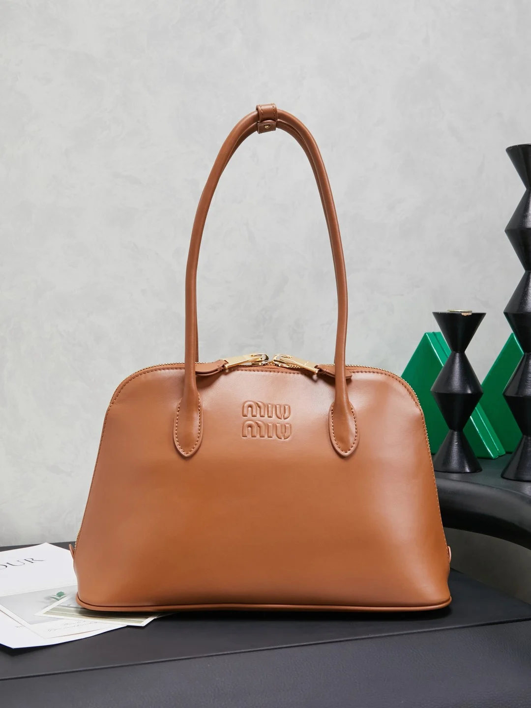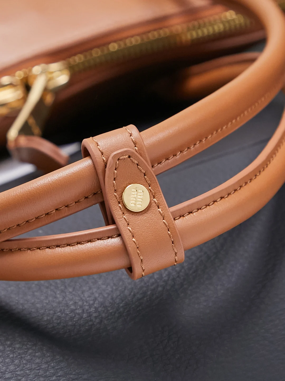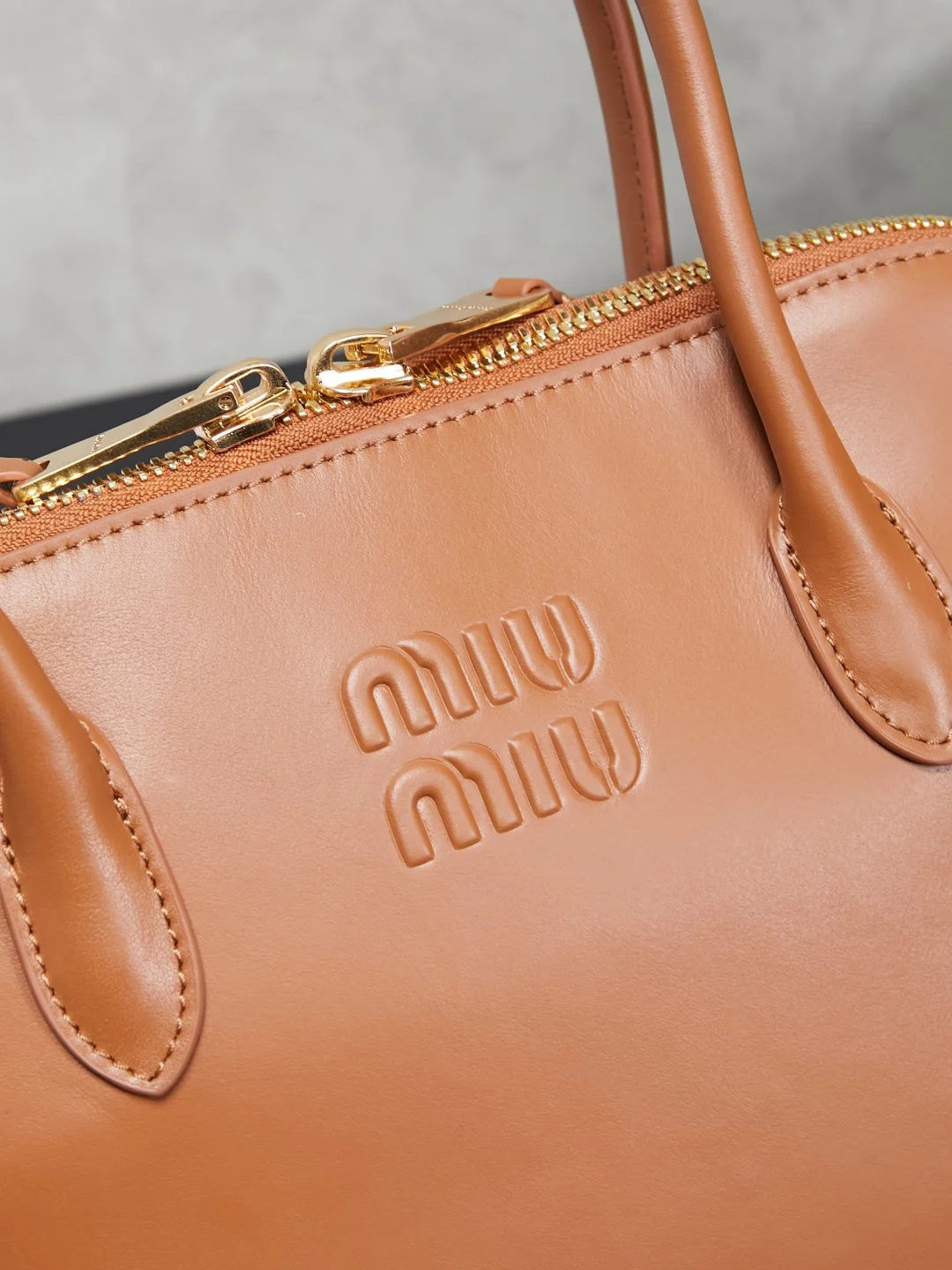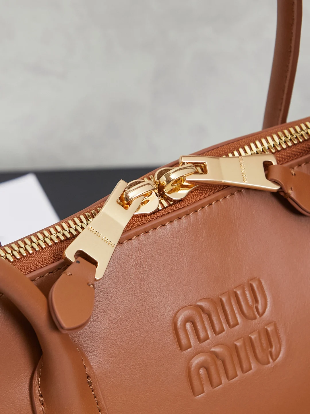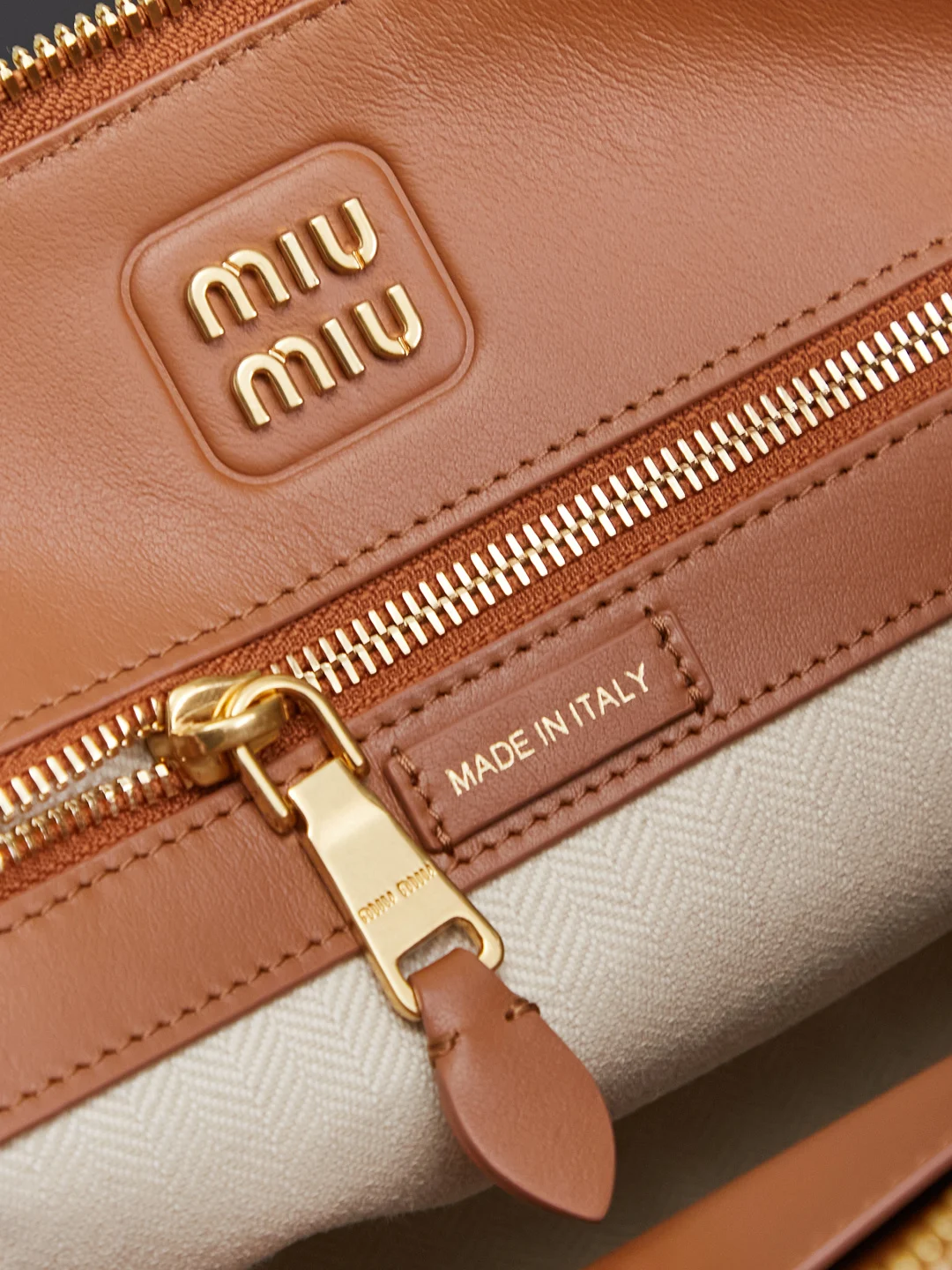 • Branding: Features a prominent embossed “Miu Miu” lettering logo on the front center.