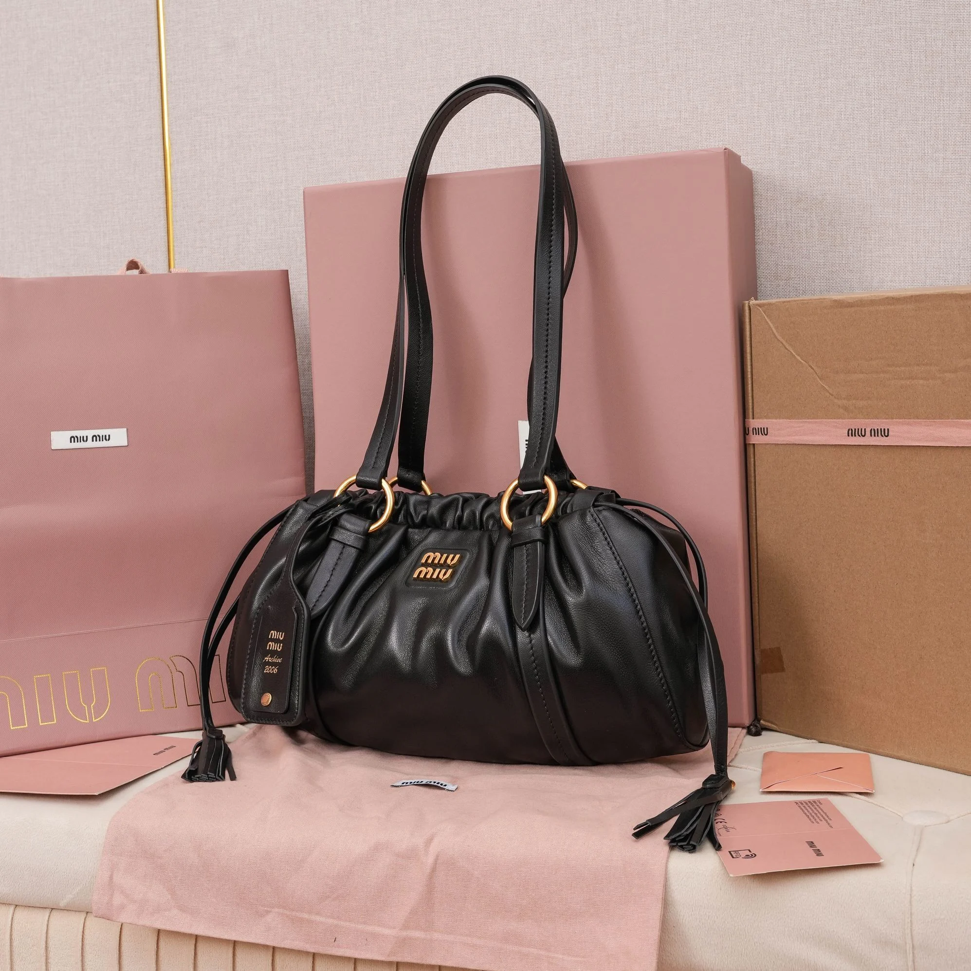 - Archival Details: Includes a removable leather trick (charm) embossed with “Miu Miu Archive 2006.”