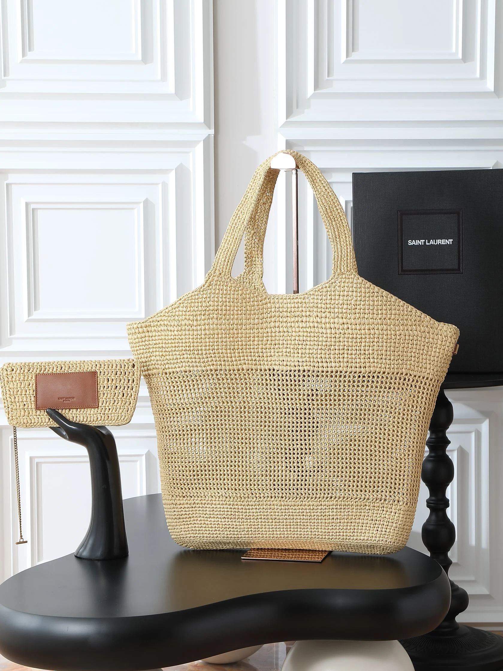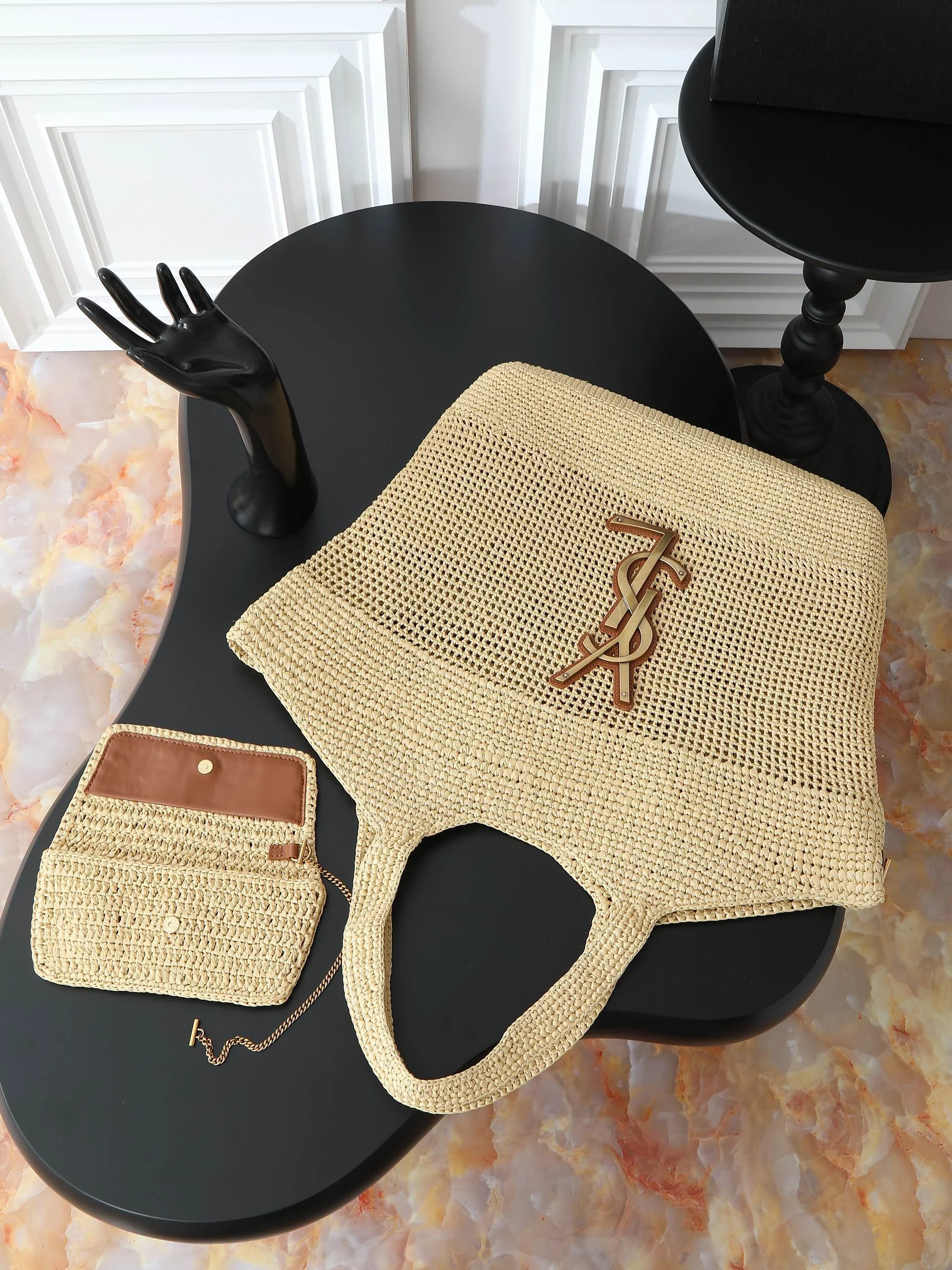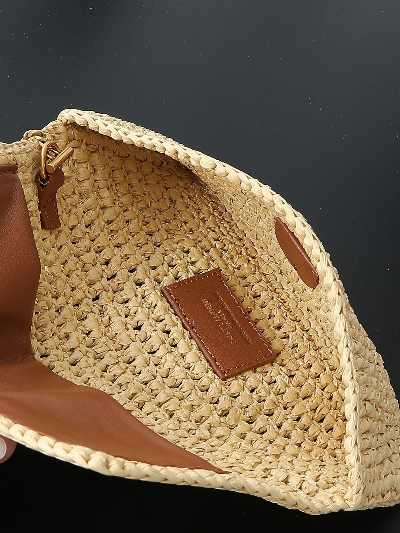 IT FEATURES a raffia sunglasses case WHICH CAN BE REMOVED THANKS TO ITS LONG CHAIN.