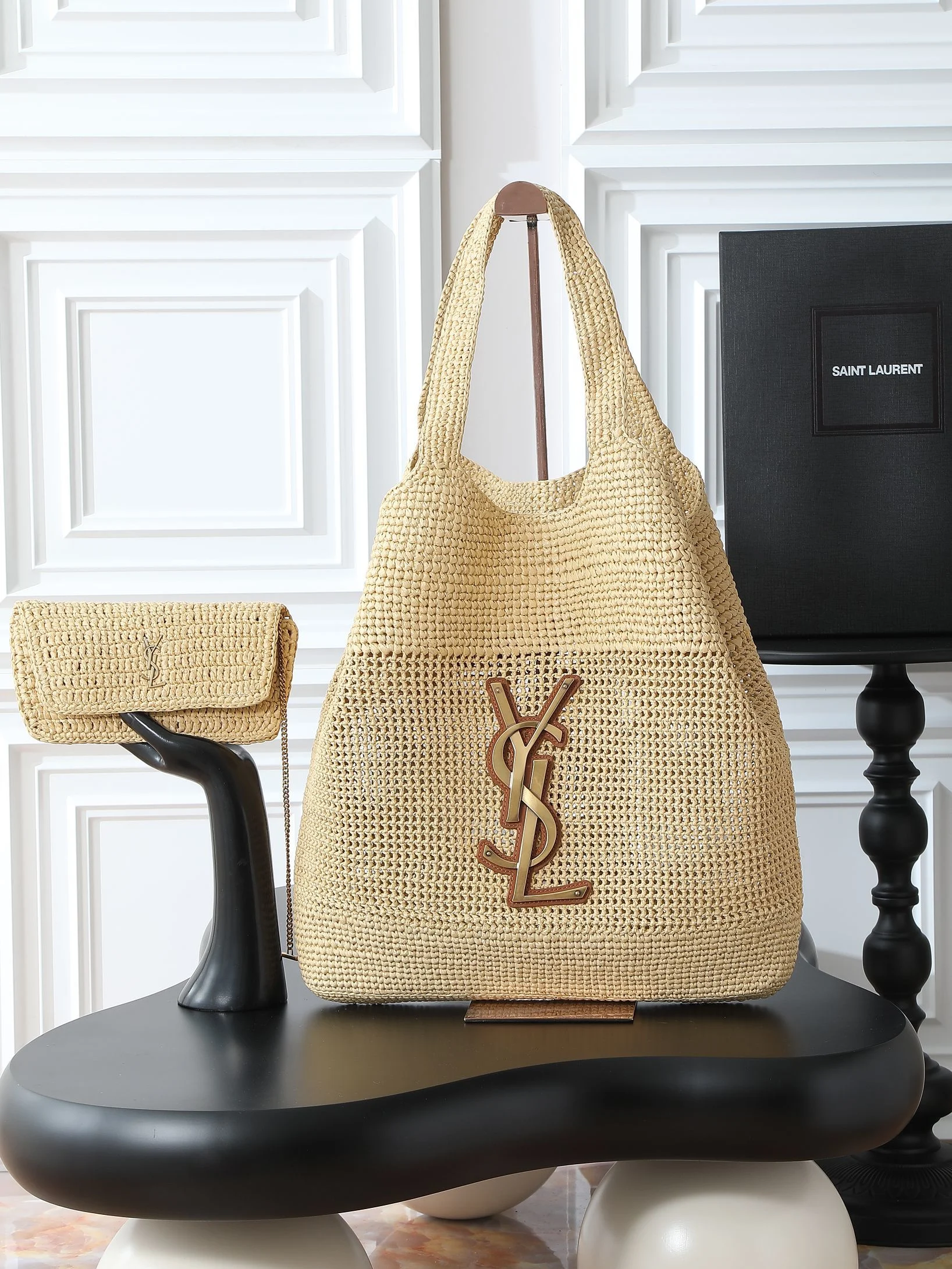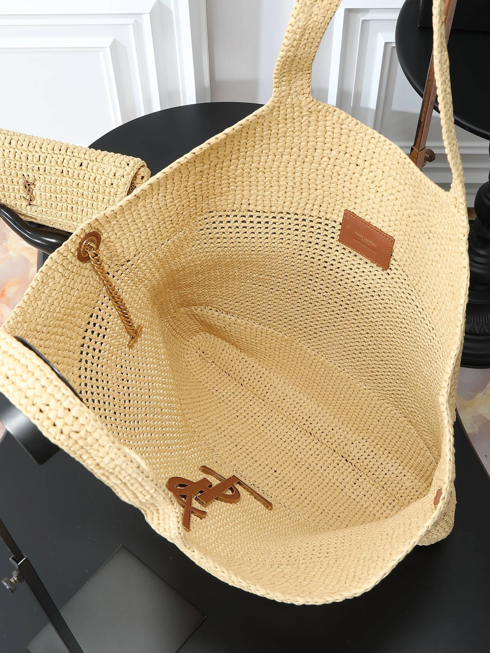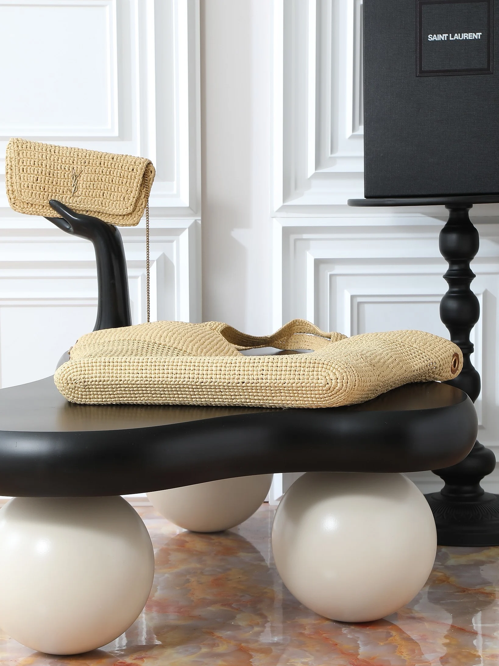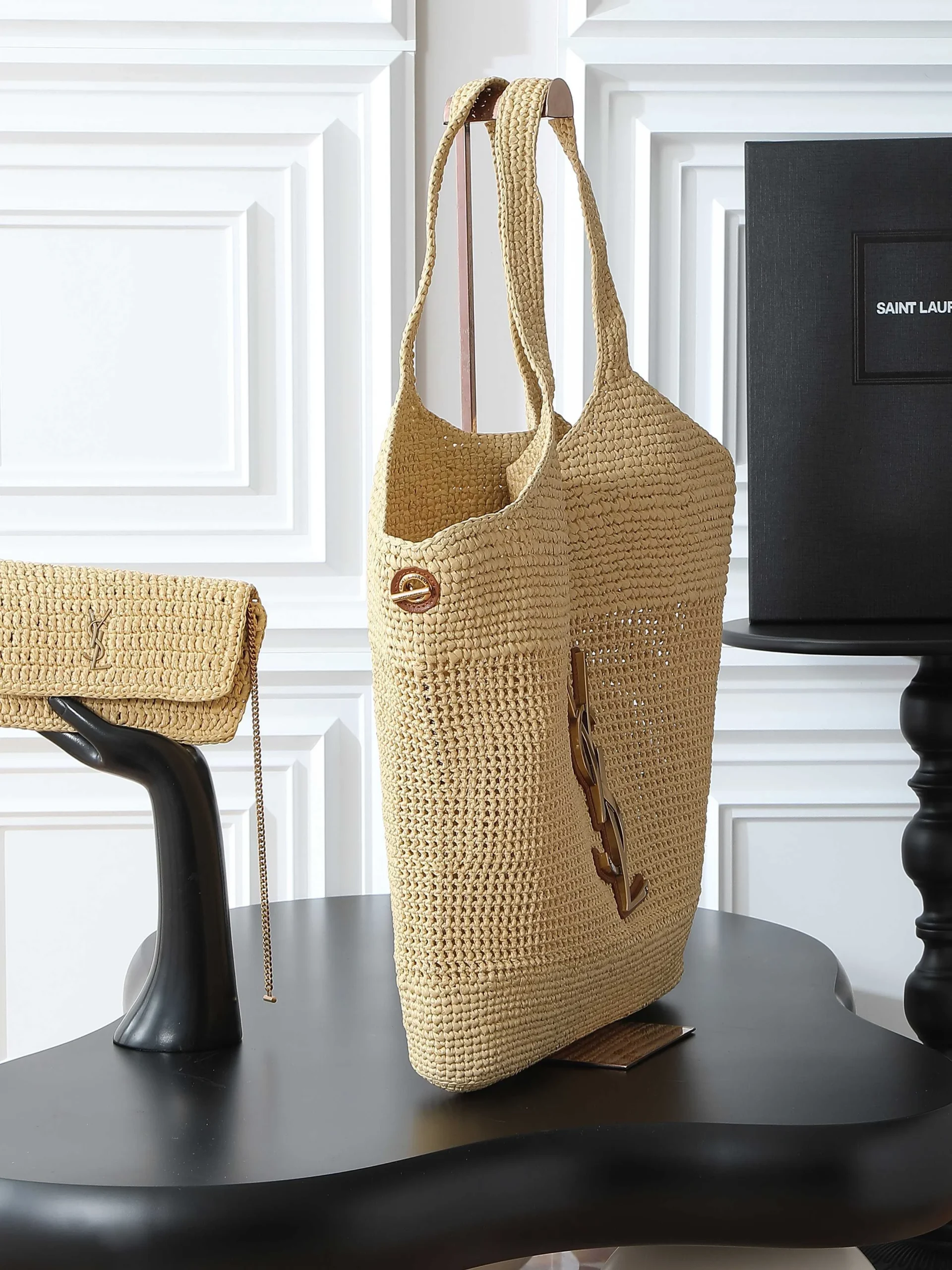 IT FEATURES a raffia sunglasses case WHICH CAN BE REMOVED THANKS TO ITS LONG CHAIN.